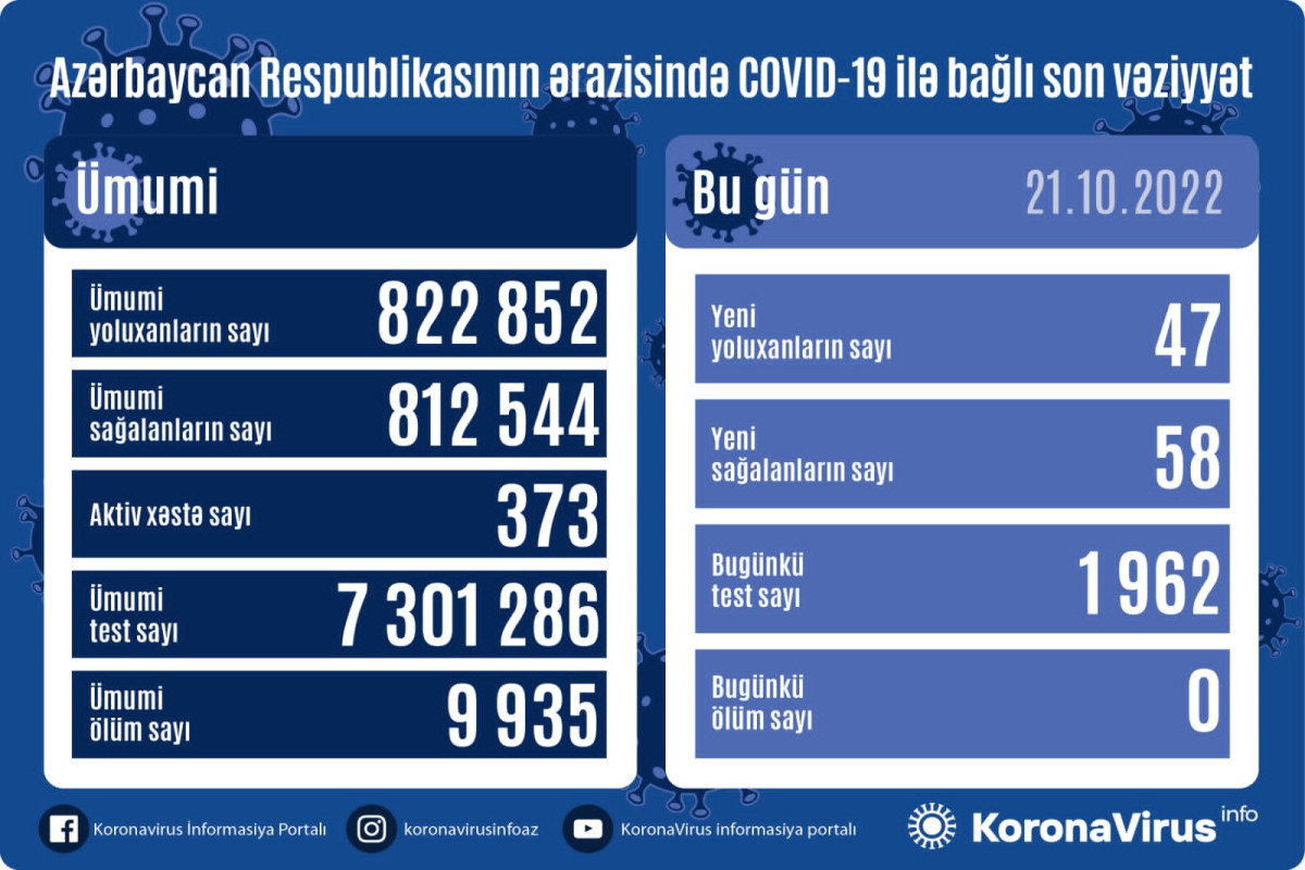 Azərbaycan Respublikasında koronavirus (COVID-19) infeksiyasına 47 yeni yoluxma faktı qeydə alınıb, 58 nəfər müalicə olunaraq sağalıb.