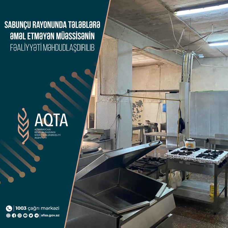 Marja.az AQTA-ya istinadən xəbər verir ki, yoxlama zamanı müəssisədə qida təhlükəsizliyi sahəsində texniki normativ hüquqi aktların tələblərinə əməl edilmədiyi müəyyən olunub.