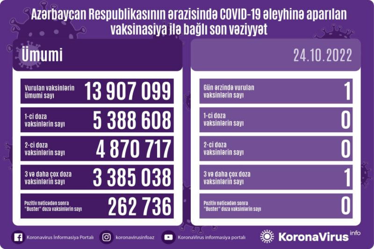 Azərbaycanda son sutkada koronavirus (COVID-19) əleyhinə cəmi bir vaksin vurulub. Son sutkada üç və daha çox doza üzrə vaksinasiya olunanların sayı 1 nəfərdir.