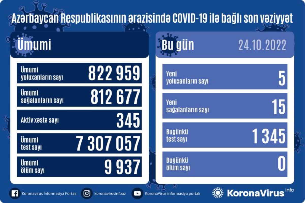 Azərbaycan Respublikasında koronavirus (COVID-19) infeksiyasına 5 yeni yoluxma faktı qeydə alınıb, 15 nəfər müalicə olunaraq sağalıb.