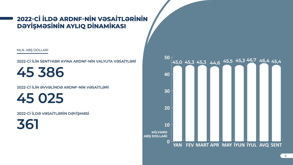 Maliyyə bazarlarında yaşanan dalğalanmalar Dövlət Neft Fondunun investisiya portfelində geriləmələrə səbəb olub.Azərbaycan Respublikası Dövlət Neft Fondu (ARDNF) bildirir ki, ARDNF-nin aktivləri 2022-ci ilin əvvəlinə (45 milyard 25,1 milyon ABŞ dolları) nisbətən 0.8% artaraq 30 sentyabr 2022-ci il tarixində 45 milyard 386,4 milyon ABŞ dolları təşkil etmişdir.