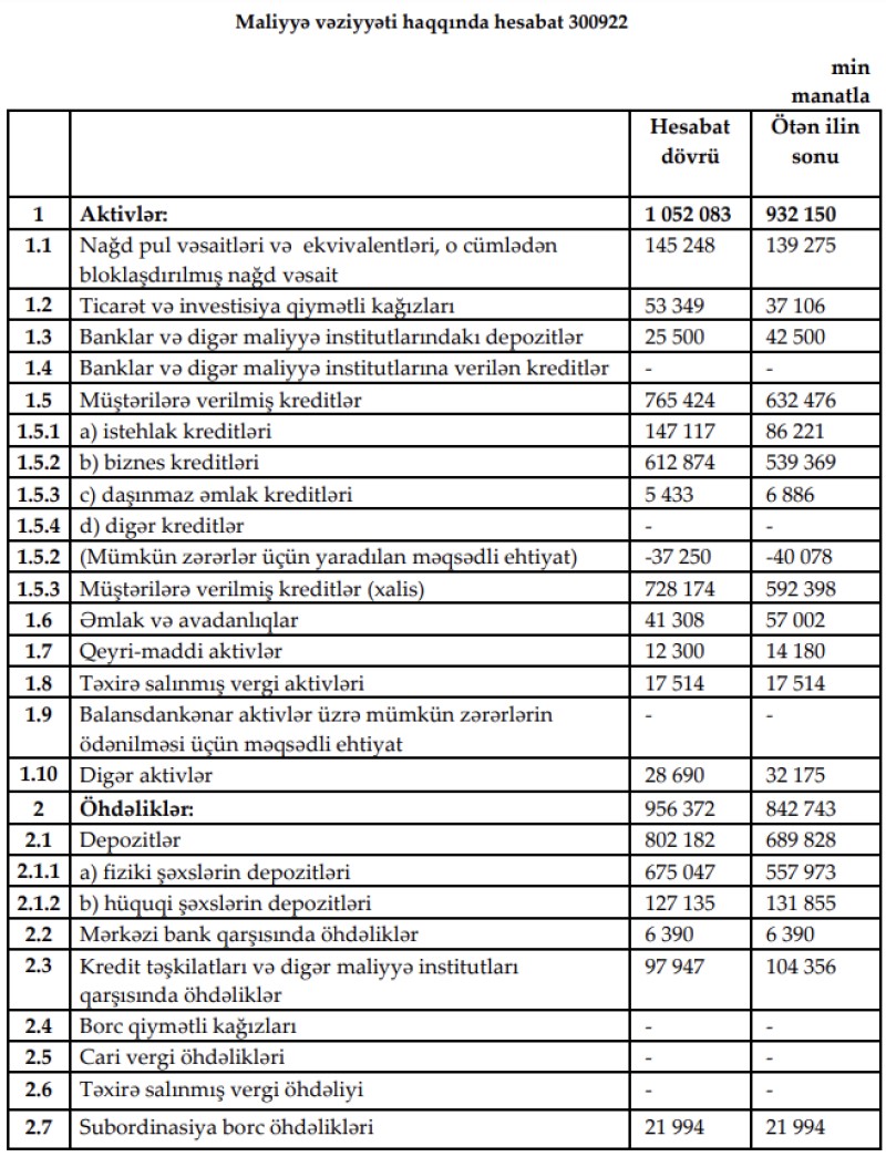 -Kredit portfeli rüb ərzində 7.4%, ilin əvvəlindən isə 21% artıb. Hazırda 765.4 milyon manat təşkil edir.