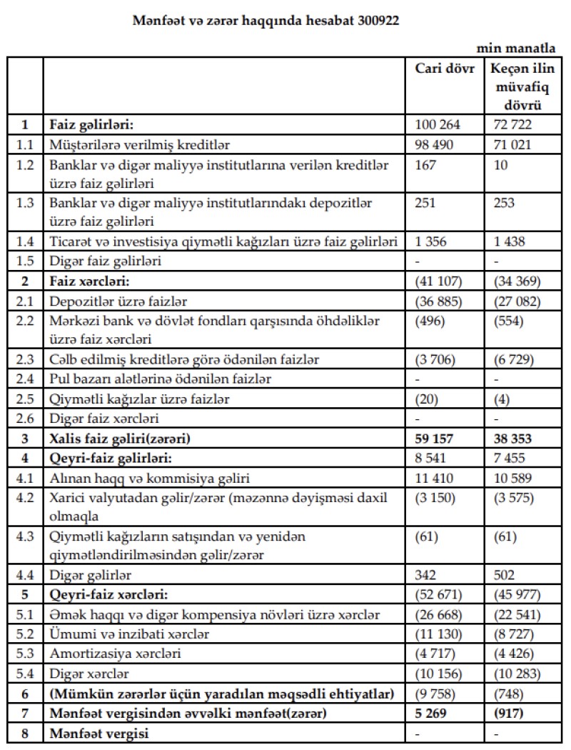 - Yekun xalis mənfəət də il ərzində dəfələrlə artaraq 5.3 milyon manata çatıb. 3-cü rüb ərzində bankın xalis mənfəəti cari ilin 2-ci rübü ilə müqayisədə 3 dəfəyə qədər artıb.