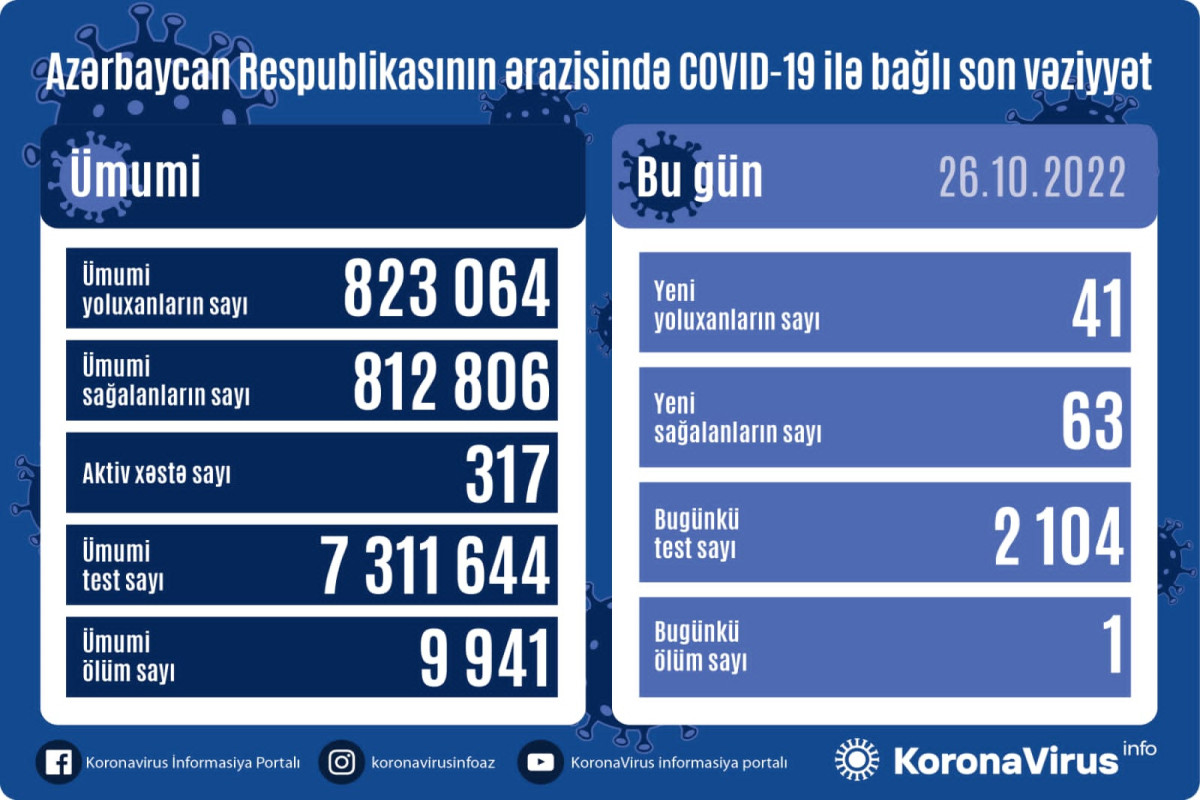 Azərbaycan Respublikasında koronavirus (COVID-19) infeksiyasına 41 yeni yoluxma faktı qeydə alınıb, 63 nəfər müalicə olunaraq sağalıb.