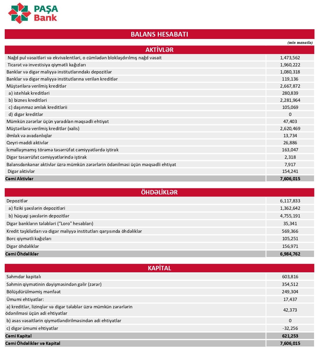 30 Sentyabr 2022-ci il tarixində "PAŞA Bank" ASC 7 milyard 606 milyon 15 min manat cəmi aktivlərə malik olub. Bank bu həcmdə aktivləri ilə bütün banklar arasında 3-cü, özəl banklar arasında isə 2-ci yerdədir.
