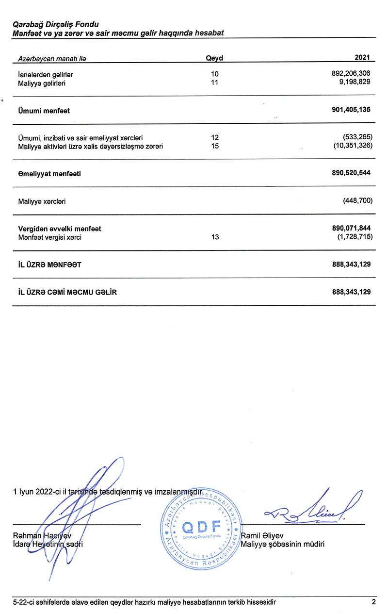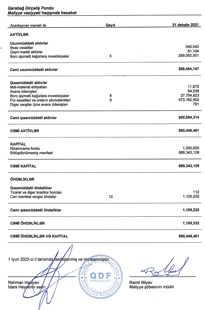 Fondun yaydığı məlumatda bildirilir ki, maliyyə hesabatları 31 dekabr 2021-ci il tarixinə maliyyə vəziyyəti haqqında hesabat, həmin tarixdə başa çatmış il üzrə mənfəət və ya zərər və sair məcmu gəlir haqqında hesabat, kapitalda dəyişikliklər haqqında hesabat və pul vəsaitlərinin hərəkəti haqqında hesabatı əhatə edir.
