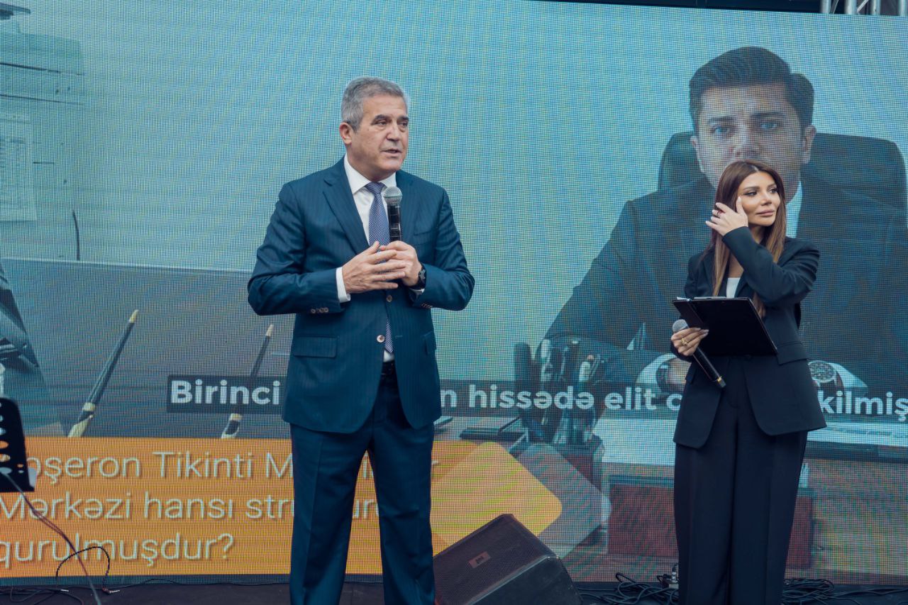“Dövlət dəstəkli layihənin yaranmasında məqsəd Azərbaycanda fəaliyyət göstərən inşaat şirkətlərini bir yerdə toplamaq, şəhərdəki sıxlığın aradan qaldırılması və böyük müştəri kütləsini bir mərkəzdə cəmləşdirməkdir. Abşeron Tikinti Materilları Mərkəzinin layihəsi 255 ha əraziyə malik ölkənin və Cənubi Qafqazın ən böyük tikinti materialları mərkəzidir. Artıq layihənin 55 ha ərazisi tam hazırlanıb istifadəyə verilib. Burada 21 korpusdan ibarət 2 mərtəbəli tam təmirli, istilik sistemli, sanitar qovşaq, 7/24 mühafizə xidməti və optik internetlə təchiz olunmuş yerlər təqdim edir. Burada 1200-ə yaxın mağaza var. Bundan başqa mərkəzdə müxtəlif cür malları saxlama qabiliyyətinə malik böyük həcmli anbarlar və “Açıq ərazi” müştərilərin xidmətinə verilir. Anbarların ümumi sahəsi 60000 kv m2-dir. “Açıq ərazi”nin ümumi sahəsi 210000 kv m2-dir”.
