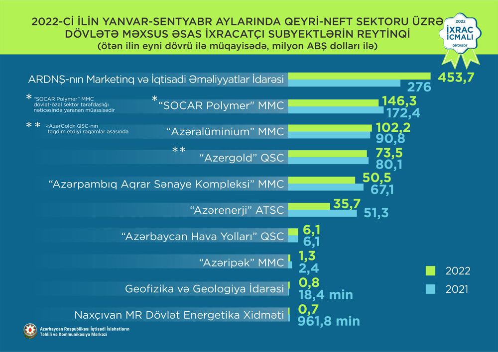 2022-ci ilin yanvar-sentyabr ayları üzrə hazırlanan qeyri-dövlət ixracatçı subyektlərin reytinqində ilk onluqda aşağıdakı şirkətlər təmsil olunurlar: