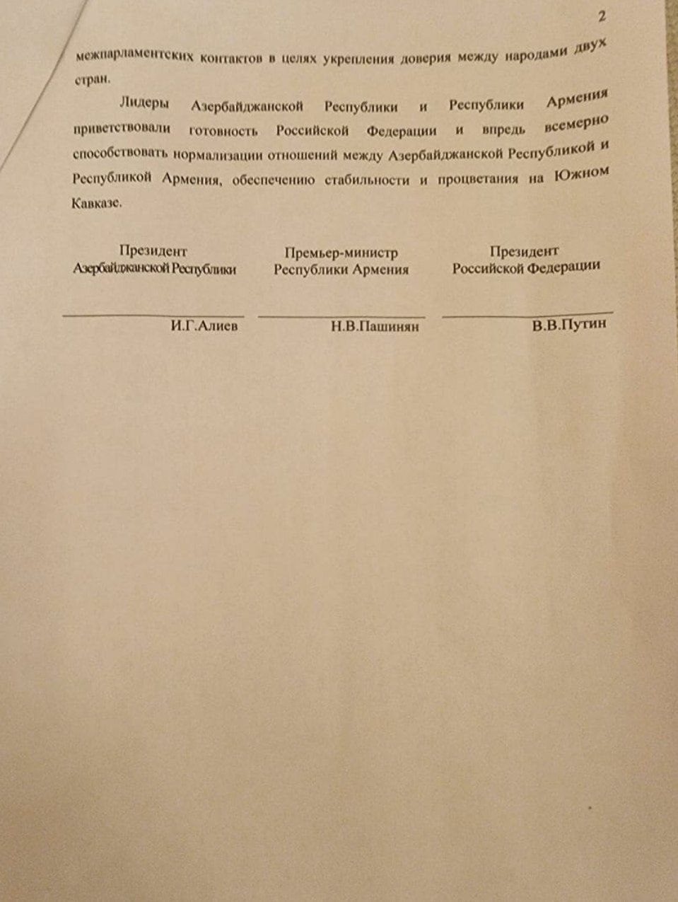 Azərbaycan-Ermənistan münasibətlərinin kompleks şəkildə normallaşdırılması, sülhün, sabitliyin, təhlükəsizliyin və Cənubi Qafqazın davamlı iqtisadi inkişafının təmin edilməsi naminə göstərilən bütün razılaşmalara dönmədən riayət edilməsinə sadiq olduğumuzu təsdiq etdik. Qalan məsələlərin, o cümlədən humanitar məsələlər blokunun təxirə salınmadan həllinə yönəlmiş əlavə səylər göstərmək barədə razılaşdıq.