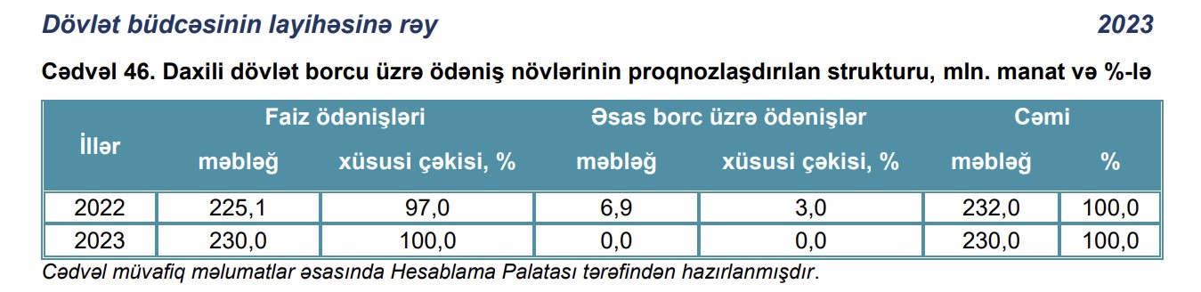 2023-cü il dövlət büdcəsinin layihəsində daxili dövlət borcu üzrə əsas borc ödənişləri nəzərdə tutulmasa da, faiz ödənişləri artımla proqnozlaşdırılmışdır (ətraflı aşağıdakı cədvəldə). Faiz xərclərinin cari ilə nisbətən 4,9 milyon manat və ya 2,2% artması əvvəlki illərdə buraxılmış və cari ilin sonuna kimi emissiya ediləcək dövlət istiqrazları üzrə faiz və diskont xərclərinin və növbəti ilə nəzərdə tutulan iri həcmli emissiyanın faiz xərclərinin ödənilməsilə əlaqələndirilmişdir.