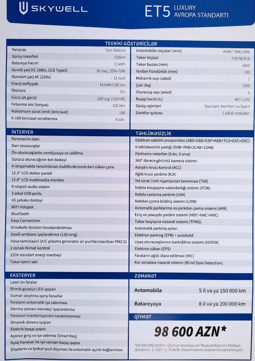 Təqdim edilən Skywell ET5 avtomobili, müasir lüks avtomobillərə məxsus bütün konfiqurasiyalar ilə tam təchiz olunmuşdur. Azərbaycana “Onvolt” MMC tərəfindən gətirilən Skywell ET5 avtomobilləri Avropa ölkələrinə ixrac üçün nəzərdə tutulmuş variantdadır və Avropa standartlarına tam cavab verir.