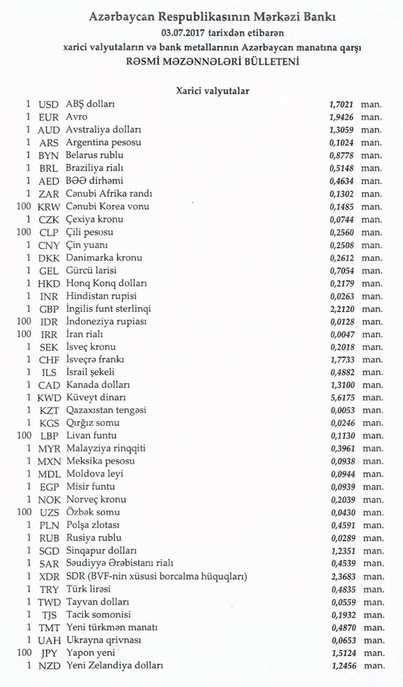 İyulun 3-nə Mərkəzi Bankın açıqladığı rəsmi Dollar/manat məzənnəsi İyunun 30-u ilə müqayisədə dəyişməyərək 1,7021 manat olub, Avro/manat məzənnəsi 1.9426 manata düşüb.