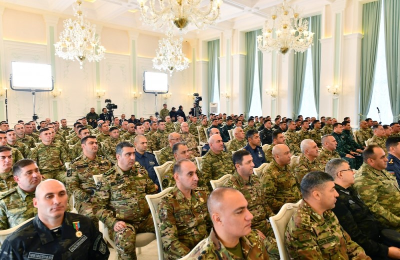 Bizim vətənpərvərlik məsələləri ilə bağlı çox fəal siyasətimiz olmuşdur. Gənc nəsli vətənpərvərlik ruhunda tərbiyə etmək Prezident kimi mənim siyasətimin əsas istiqamətlərindən biri idi və buna nail olduq. Gənclərimiz vətənpərvərdir, Vətənə bağlıdır və İkinci Qarabağ müharibəsi bunu göstərdi. Bir daha demək istəyirəm, heç vaxt Qarabağı görməyən gənclərimiz Qarabağ uğrunda ölümə getməyə hazır idilər və ölümə gedirdilər, cəmiyyətdə milli birlik, milli həmrəylik ideyaları üstünlük təşkil etdi. Eyni zamanda, Azərbaycanda yaşayan bütün xalqlar mənim apardığım siyasət nəticəsində daha sıx birləşdilər. Mən dəfələrlə deyirdim, bu gün də deyirəm, biz böyük ailəyik. Azərbaycanda yaşayan bütün xalqlar bir böyük ailənin üzvləridir. Yaxşı günlərdə, ağır günlərdə bir yerdəyik və bu birlik dünya miqyasında nadir dəyərdir. Baxın, biz başqa ölkələrin timsalında milli, dini, etnik zəmində narazılıq, toqquşma, inamsızlıq görürük. Azərbaycanda nə görürük - birlik, qardaşlıq, dostluq! Azərbaycanda yaşayan bütün xalqlar Qarabağ uğrunda ölümə gedirdilər. Bu, bizim böyük dəyərimizdir. Biz bunu, bu dəyəri daim qoruyub saxlamalıyıq, gücləndirməliyik. İkinci Qarabağ müharibəsi ölkəmizdə milli həmrəyliyi, milli birliyi daha da gücləndirdi, ölkəmizi gücləndirdi. Biz bu ağır yükü çiynimizdən atdıq, bu damğanı boynumuzdan atdıq. Biz indi başımızı dik tutub istənilən tədbirdə, istənilən formatda sözümüzü deyirik. Biz üzümüz ağ, alnımız açıq, müzəffər xalq kimi yaşayırıq. Buna görə sizə və sizin kimi on minlərlə hərbçiyə borcluyuq. Azərbaycan xalqı bunu bilir və yaxşı qiymətləndirir.