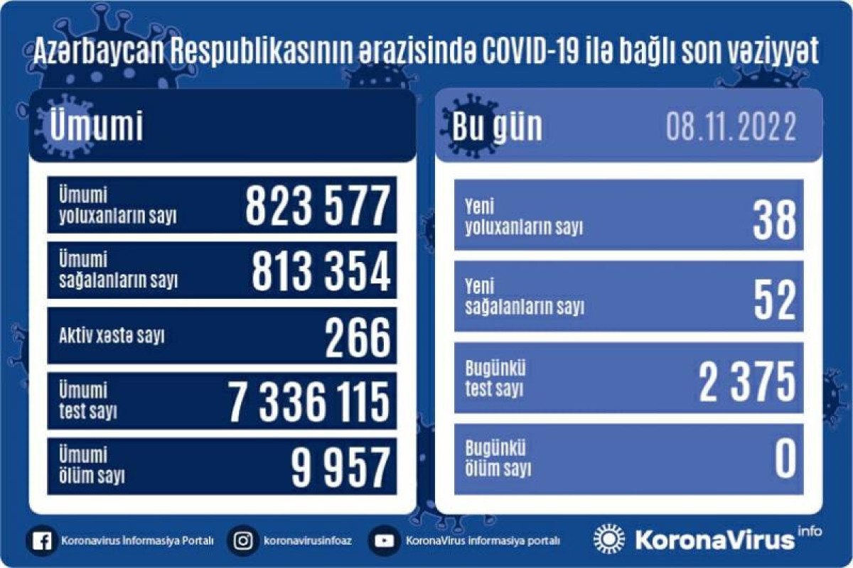 Azərbaycan Respublikasında koronavirus (COVID-19) infeksiyasına 38 yeni yoluxma faktı qeydə alınıb, 52 nəfər müalicə olunaraq sağalıb.