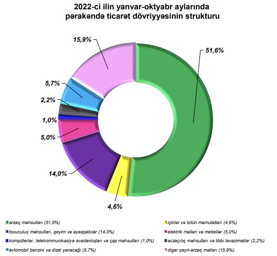 2022-ci ilin yanvar-oktyabr aylarında alıcıların pərakəndə ticarət şəbəkəsində aldıqları mallara xərclədiyi vəsaitin 51,6 faizi ərzaq məhsullarının, 4,6 faizi içkilər və tütün məmulatlarının, 14,0 faizi toxuculuq məhsulları, geyim və ayaqqabıların, 5,7 faizi avtomobil benzini və dizel yanacağının, 5,0 faizi elektrik malları və mebellərin, 2,2 faizi əczaçılıq məhsulları və tibbi ləvazimatların, 1,0 faizi kompüterlər, telekommunikasiya avadanlıqları və çap məhsullarının, 15,9 faizi isə digər qeyri-ərzaq mallarının alınmasına sərf olunmuşdur.