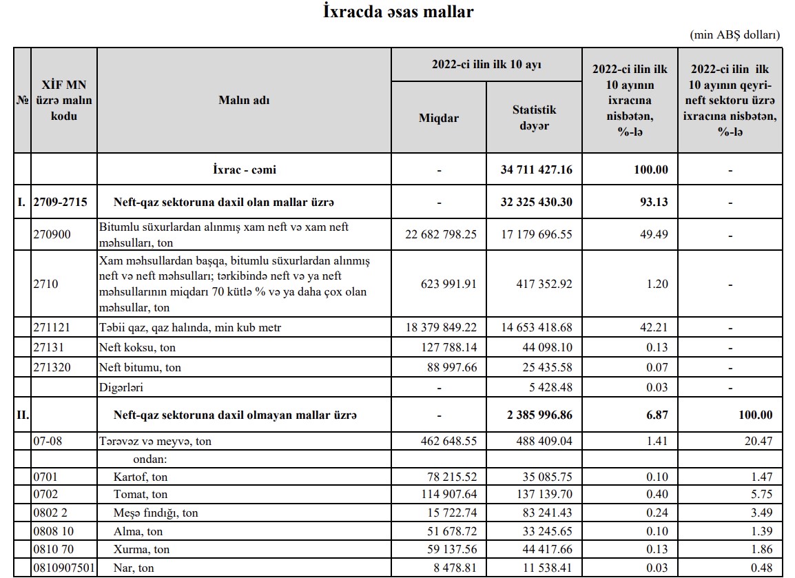 2022-ci ilin yanvar-oktyabr dövründə Azərbaycandan 17 milyard 179 milyon 696 min dollarlıq xam neft və 14 milyard 653 milyon 418 min dollarlıq təbii qaz ixrac edilib.