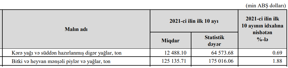 Azərbaycana 2021-ci ilin 10 ayı ərzində 64 milyon 574 min dollar dəyərində 12 min 488 ton kərə yağı və süddən hazırlanmış digər yağlar idxal edilmişdi.