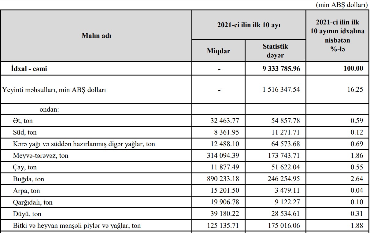 2021-ci ilin 10 ayında Azərbaycana 1 milyard 516 milyon 347 min dollar dəyərində yeyinti məhsulları idxal edilmişdi.