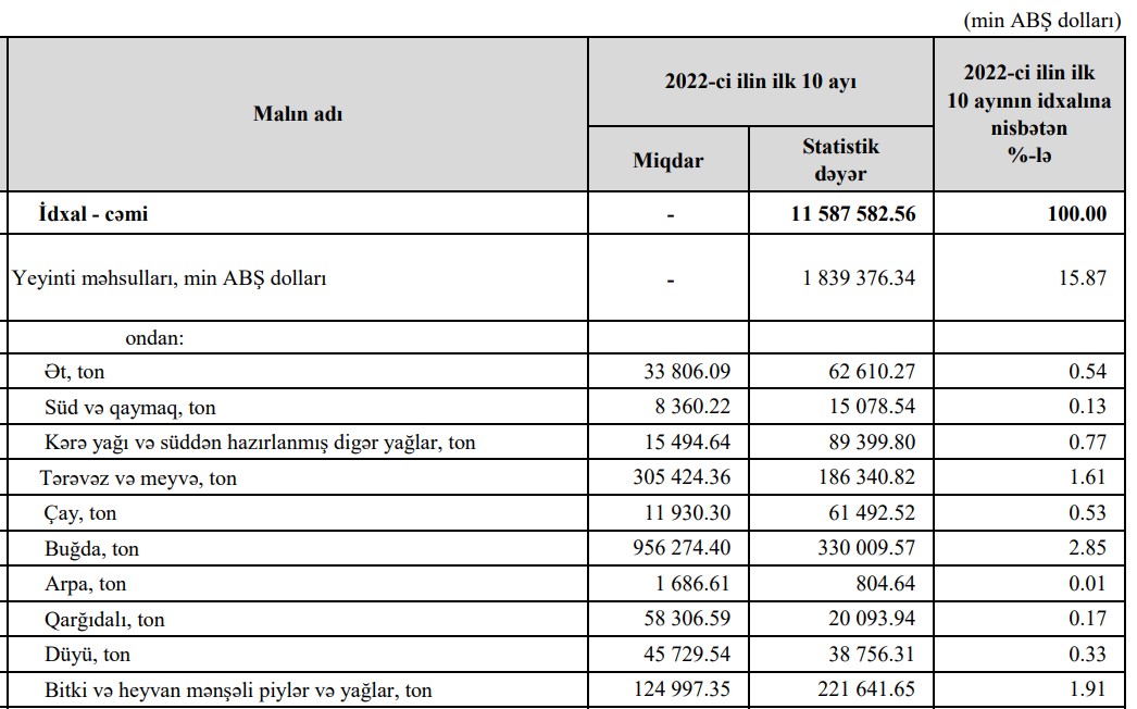 2022-ci ilin 10 ayında Azərbaycana 1 milyard 839 milyon 376 min dollar dəyərində yeyinti məhsulları idxal edilib.
