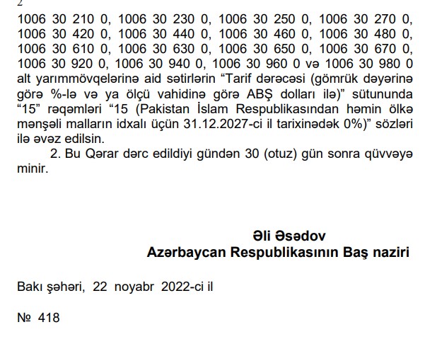 Nazirlər Kabinetinin Qərarına əsasən Pakistan İslam Respublikasından idxal edilən həmin ölkə mənşəli düyünün 31.12.2027-ci il tarixinədək idxal gömrük rüsumundan azad edildi.Pakistan İslam Respublikasından Azərbaycana idxal olunan düyü 15 faiz gömrük rüsumundan azad edilir.