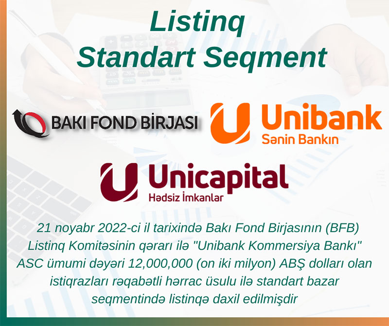 21 noyabr 2022-ci il tarixində Bakı Fond Birjasının (BFB) Listinq Komitəsinin qərarı ilə "Unibank Kommersiya Bankı" ASC ümumi dəyəri 12 milyon ABŞ dolları olan istiqrazları standart bazar seqmentində listinqə daxil edilib.