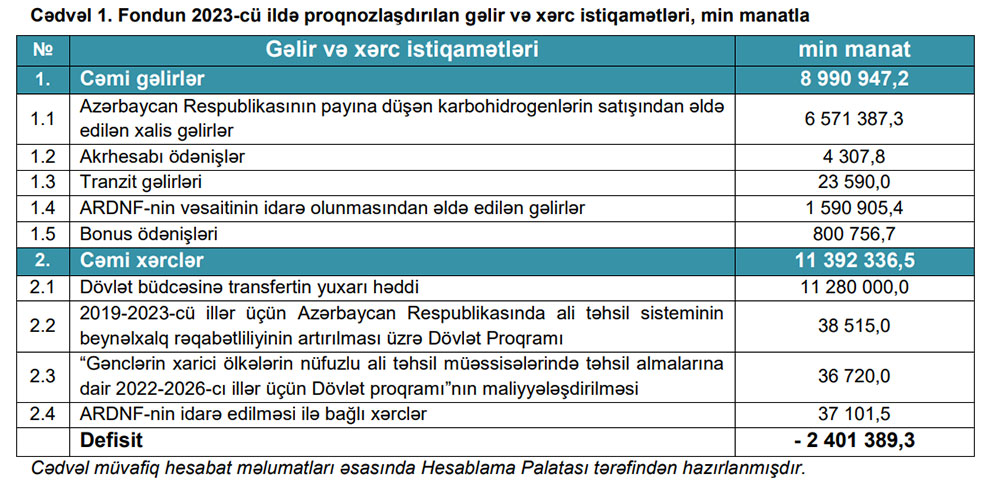 Azərbaycan Respublikası Dövlət Neft Fondunun 2023-cü il büdcəsi 2 milyard 401 milyon 400 min manat kəsirlə proqnozlaşdırılır.