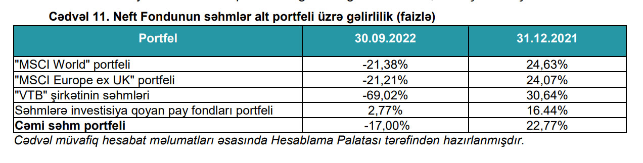"Son onilliklərin ən yüksək inflyasiya göstəriciləri, mərkəzi bankların sərt pul siyasəti, Rusiya-Ukrayna münaqişəsi, Covid-19 virusunun yenidən yayılma təhlükəsi, qlobal iqtisadiyyatın artım sürətinin aşağı düşməsi səhm bazarlarına da öz neqativ təsirlərini göstərmişdir. Belə ki, Azərbaycan Respublikası Dövlət Neft Fondunun səhm alt portfelində 2022-ci ilin 9 ayında mənfi 17% gəlirlilik müşahidə edilmiş, növbəti ildə isə nisbətən nikbin proqnozlar gözlənilməklə təqribən bu portfel üzrə gəlirliliyin 3-4% ətrafında olması gözlənilməkdədir".