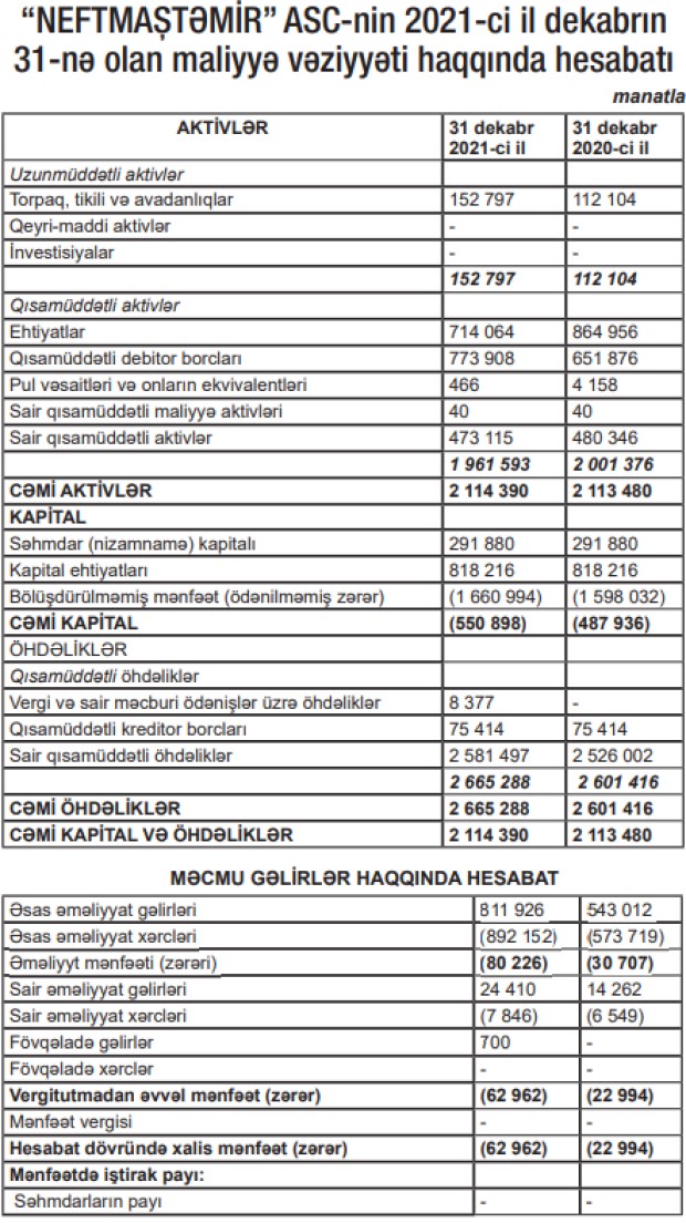 “Neftmaştəmir” ASC 2021-ci ili 62 min 962 manat xalis zərər ilə başa vurub. 2020-ci illə müqayisədə 2021-ci ildə şirkətin xalis zərəri 2,7 dəfə artıb. “Neftmaştəmir” 2020-ci ili 22 min 994 manat xalis zərər ilə bağlamışdı.