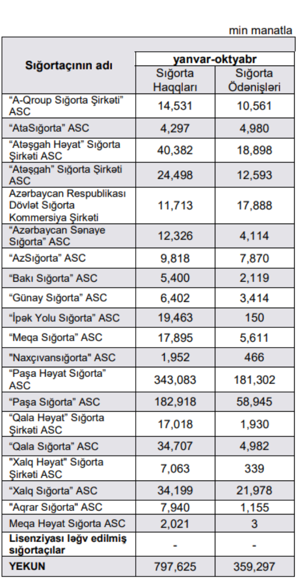 2022-ci ilin yanvar-oktyabr aylarında Azərbaycandakı 20 sığorta şirkəti tərəfindən 797 milyon 625 milyon manat sığorta haqları hesablanıb.