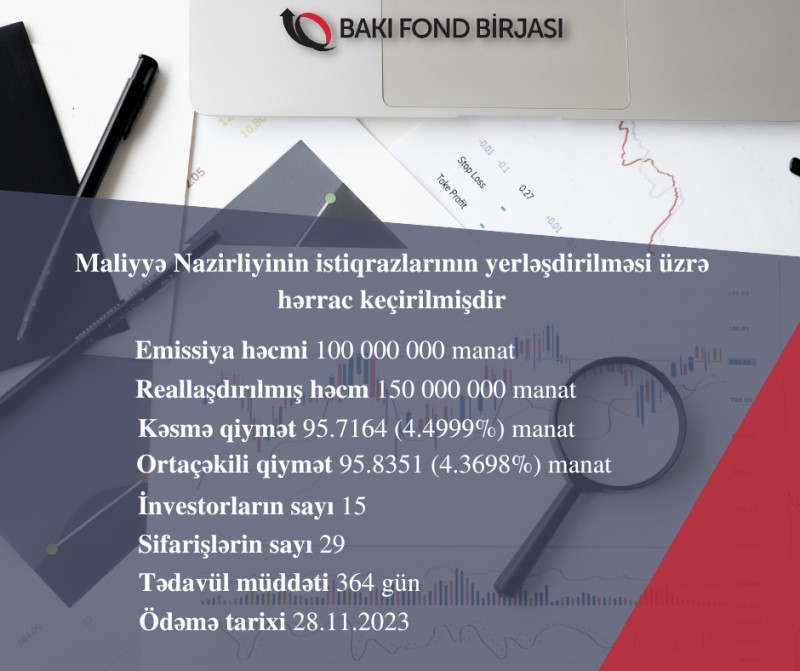 29 noyabr 2022-ci il tarixində Bakı Fond Birjasında Azərbaycan Respublikasının Maliyyə Nazirliyinin AZ0104002974 ISIN-li, 100 milyon manat həcmində, 364 gün tədavül müddətli dövlət qısamüddətli istiqrazlarının (DQİ) yerləşdirilməsi üzrə hərrac keçirilib.