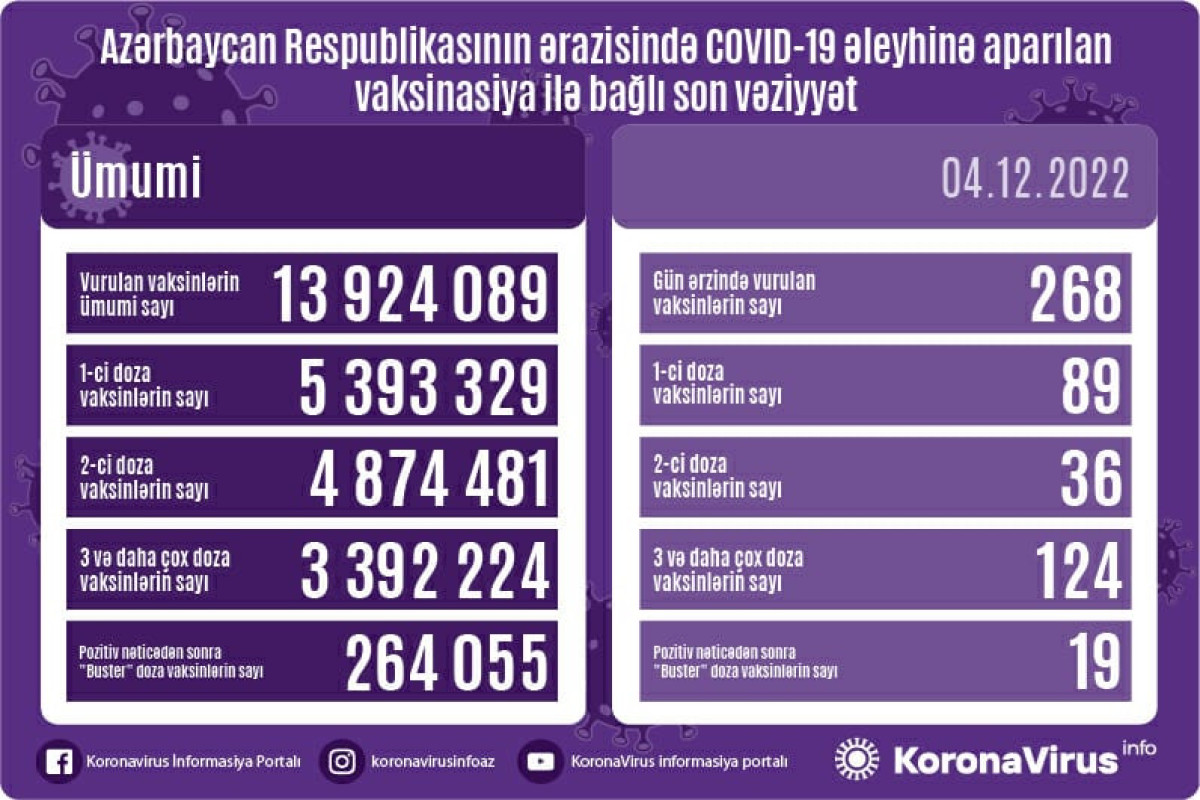 Azərbaycanda son sutkada 268 koronavirus (COVID-19) əleyhinə vaksin vurulub. Bir gündə birinci mərhələ üzrə vaksinasiya olunanların sayı 99, ikinci mərhələ üzrə vaksinasiya olunanların sayı 36, üç və daha çox doza üzrə vaksinasiya olunanların sayı 124, pozitiv nəticədən sonra buster doza üzrə vaksinasiya olunanların sayı 19 nəfərdir.