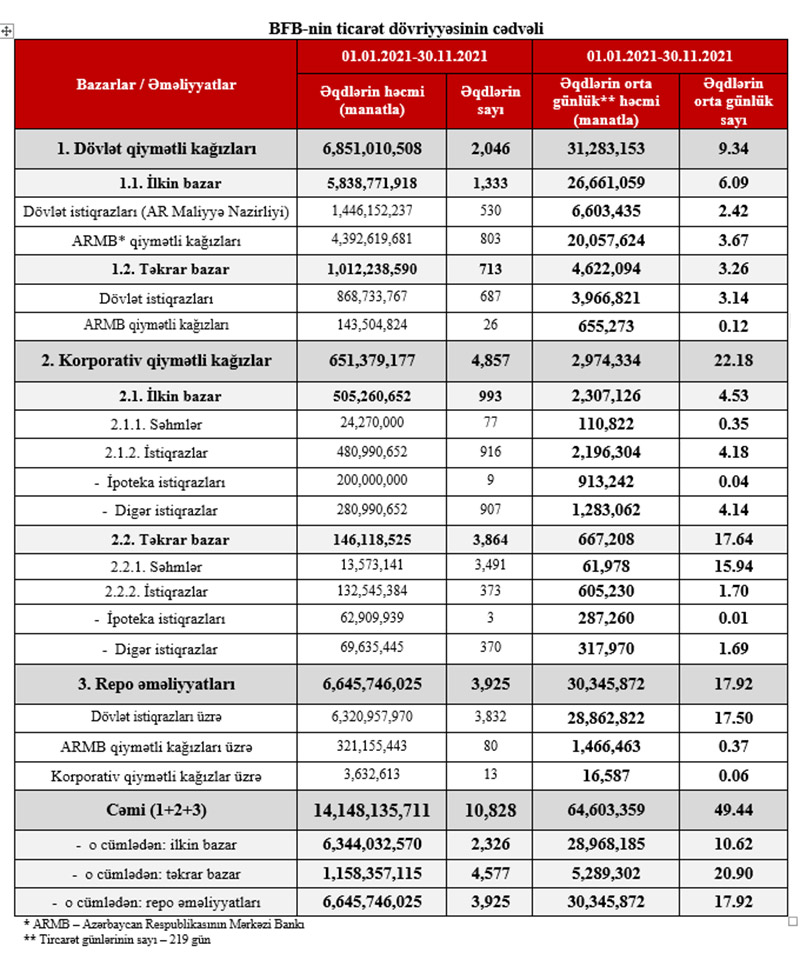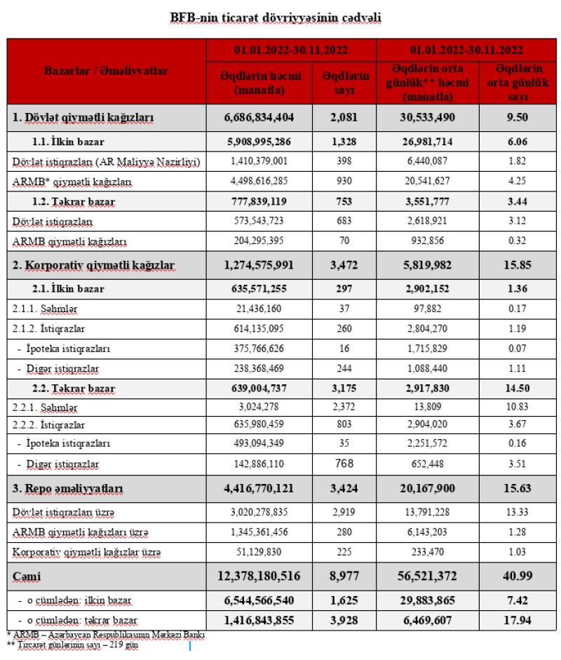 Təkrar bazarda dövlət istiqrazıarı ilə əməliyyatların həcmi 2021-ci ilin 10 ayı ərzində 868 milyon 733 min manat ikən, 2022-ci ilin 10 ayı ərzində 573 milyon 544 min manata düşüb.