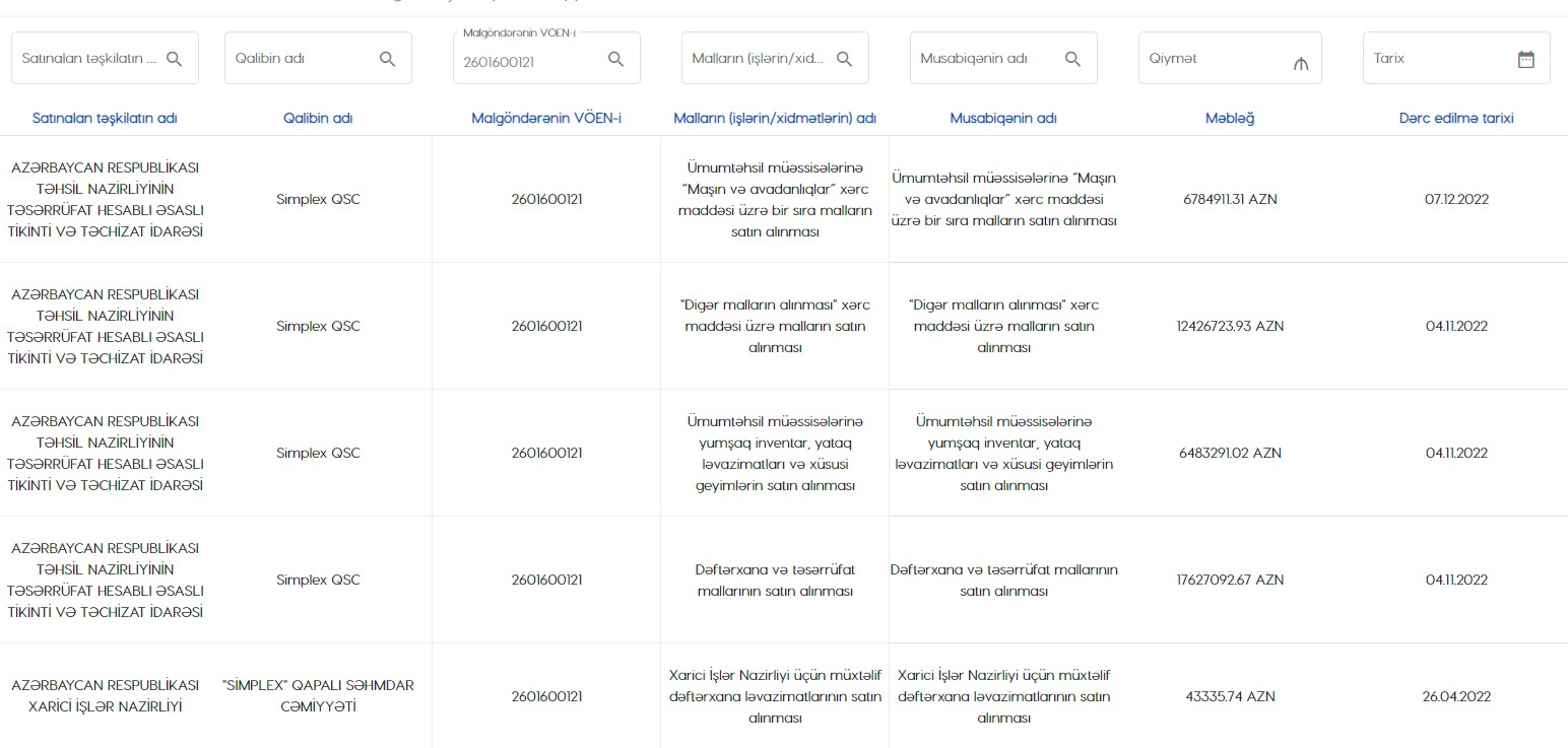 Marja.az xəbər verir ki, "Simplex" şirkəti 2022-ci ildə dövlət qurumları tərəfindən keçirilmiş tenderlərdə 8 dəfə qalib olub, o cümlədən, 4 dəfə Elm və Təhsil Nazirliyinin tenderlərində qalib elan edilib.
