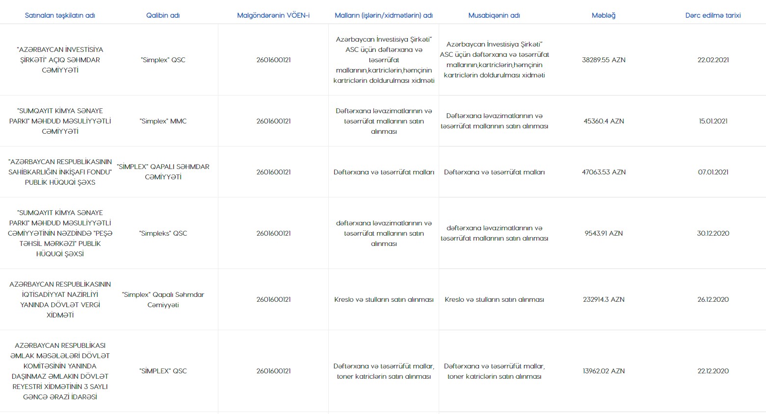 Satınalma portalında verilən məlumata görə, 2021-ci ildə "Simplex" QSC Elm və Təhsil Nazirliyindən “Maşın və avadanlıqlar” xərc maddəsi üzrə bir sıra malların satın alınmasıüzrə 241 milyon 673 min 225 manatlıq və "İdman inventarının və digər avadanlıqların satın alınması" üzrə 146 milyon 486 min 551 manatlıq sifarişlər də alıb. Qeyd edək ki, bu məbləğlər yanlış da ola bilər, çünki satınalma portalında müqavilə məbləğlərinin səhv daxil edilməsi halları tez-tez baş verir.