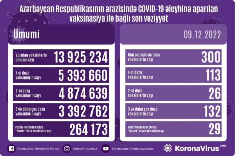 Azərbaycanda son sutkada koronavirus (COVID-19) əleyhinə 300 vaksin vurulub. Bir gündə birinci mərhələ üzrə vaksinasiya olunanların sayı 113, ikinci mərhələ üzrə vaksinasiya olunanların sayı 26, üç və daha çox doza üzrə vaksinasiya olunanların sayı 132, pozitiv nəticədən sonra buster doza üzrə vaksinasiya olunanların sayı 29 nəfərdir.