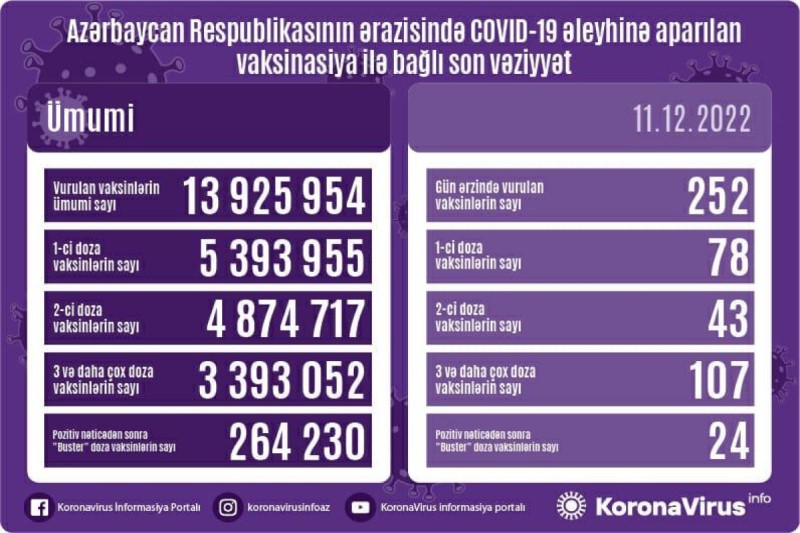 Azərbaycanda son sutkada koronavirus (COVID-19) əleyhinə 252 vaksin vurulub. Bir gündə birinci mərhələ üzrə vaksinasiya olunanların sayı 78, ikinci mərhələ üzrə vaksinasiya olunanların sayı 43, üç və daha çox doza üzrə vaksinasiya olunanların sayı 107, pozitiv nəticədən sonra buster doza üzrə vaksinasiya olunanların 24 sayı nəfərdir.