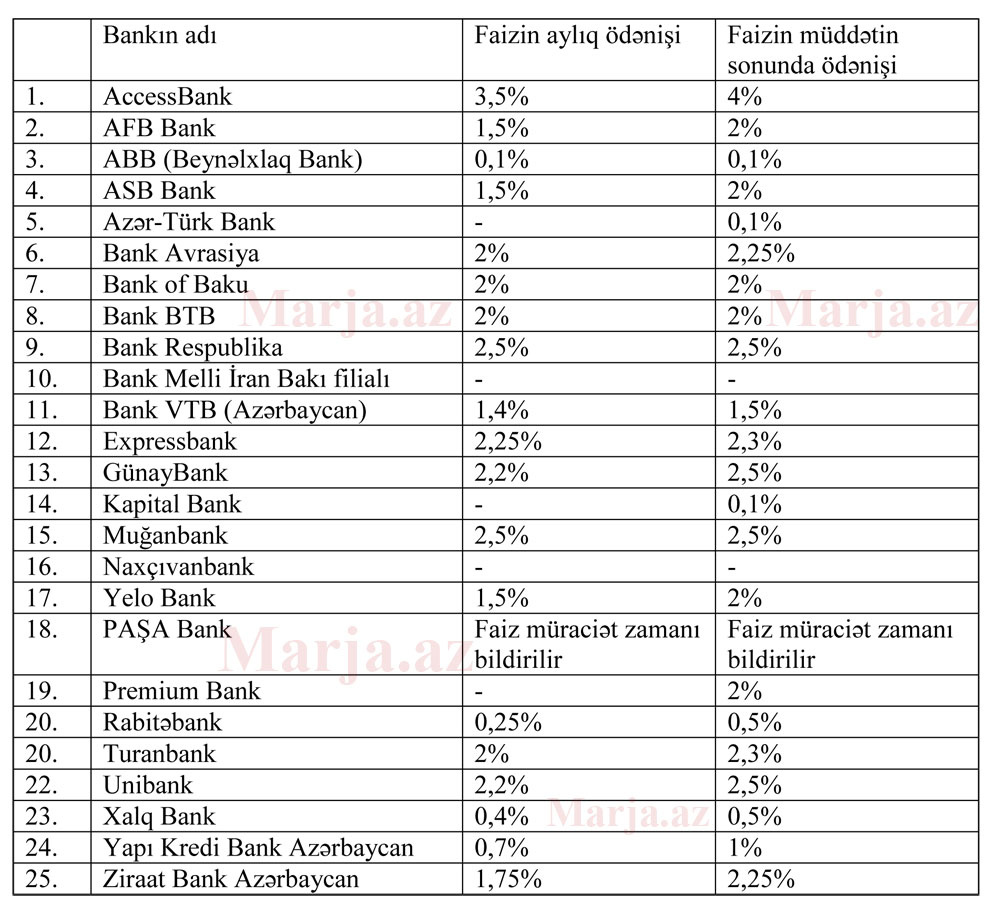 - Cədvəldə; faizlərin "hər ay" və "müddətin sonunda" götürülməsindən asılı olaraq 1 illik (12 ay) qəbul edilən ABŞ Dolları əmanətinin faizləri göstərilib.