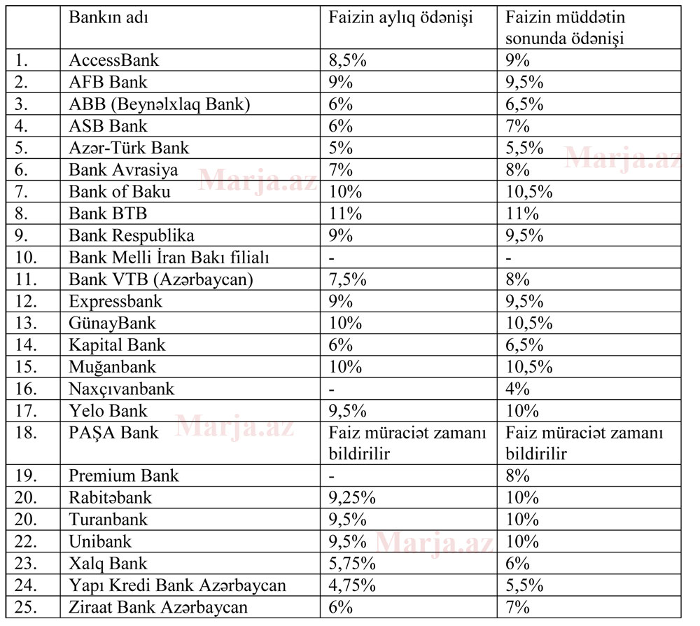 Hazırda 12 ay müddəti üzrə ən yüksək əmanət faizlərini Bank BTB, Bank of Baku, Günay Bank, Muğanbank, Yelo Bank, Rabitəbank, Turanbank və Unibank təklif edir.