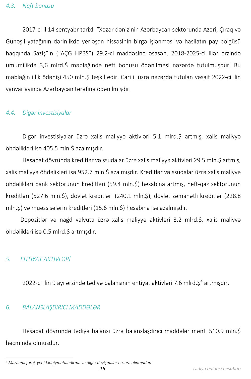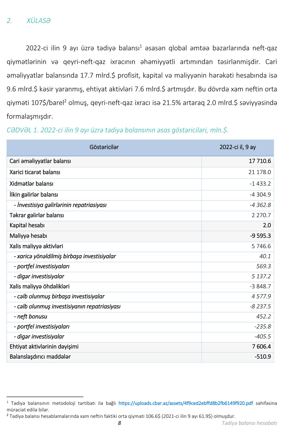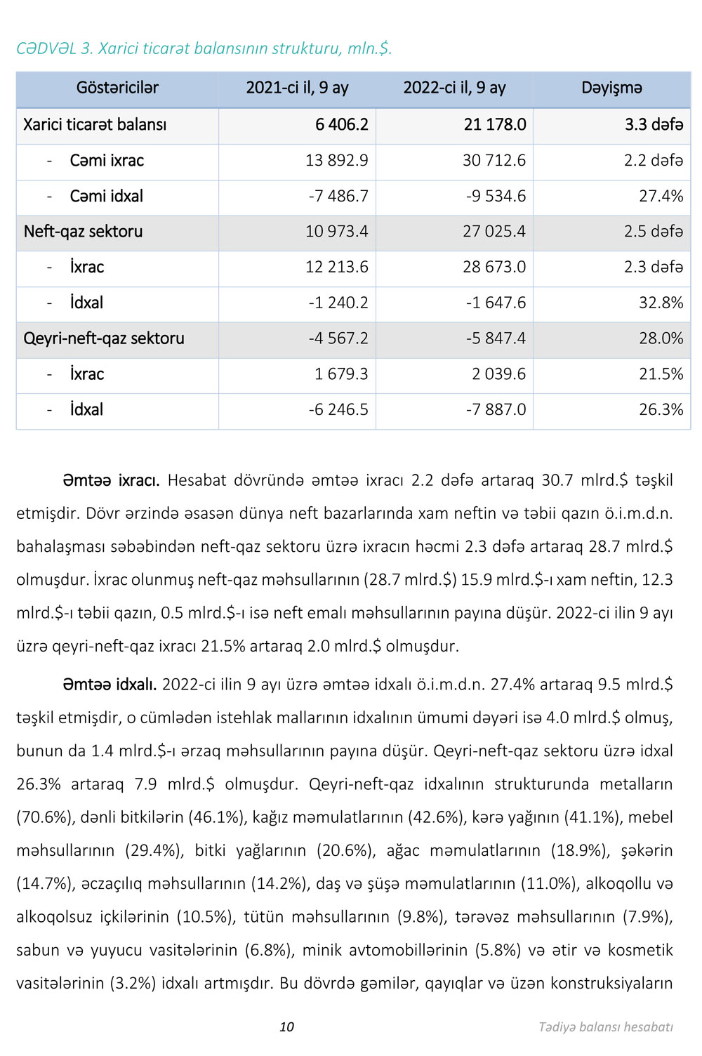 Qeyd edək ki, 2022-ci ilin 9 ayı üzrə tədiyə balansı əsasən qlobal əmtəə bazarlarında neft-qaz qiymətlərinin və qeyri-neft-qaz ixracının əhəmiyyətli artımından təsirlənmişdir. Cari əməliyyatlar balansında 17.7 milyard dollar profisit, kapital və maliyyənin hərəkəti hesabında isə 9.6 milyard dollar kəsir yaranmış, ehtiyat aktivləri 7.6 milyard dollar artmışdır. Bu dövrdə xam neftin orta qiyməti 107 dollar/barel olmuş, qeyri-neft-qaz ixracı isə 21.5% artaraq 2 milyard dollar səviyyəsində formalaşmışdır.