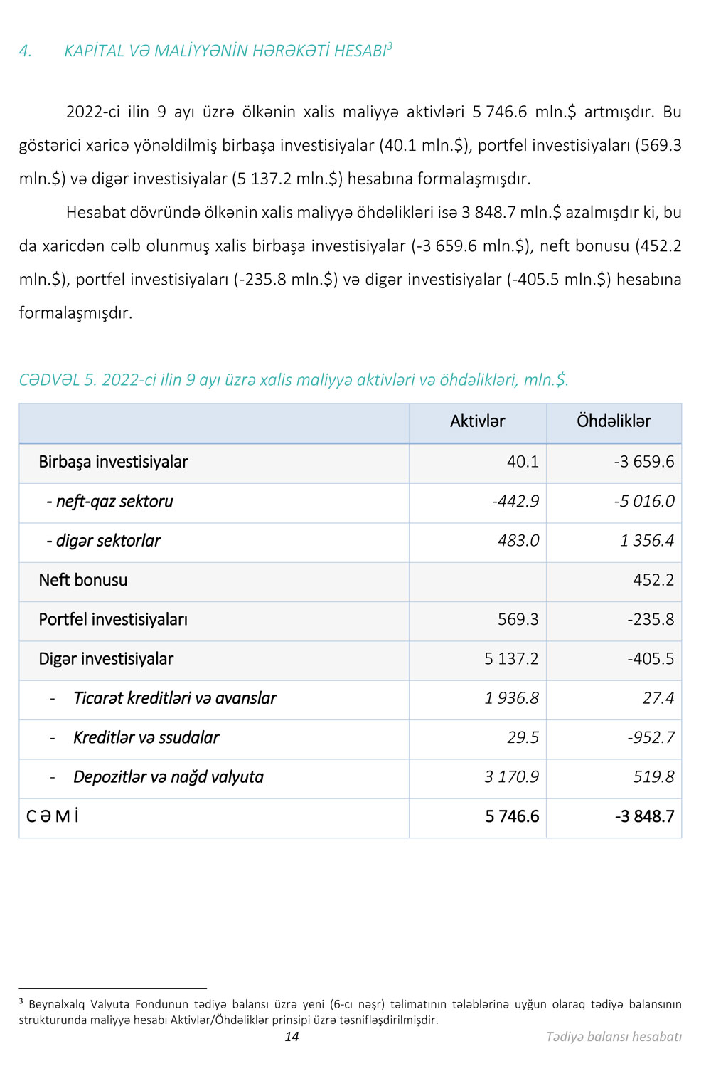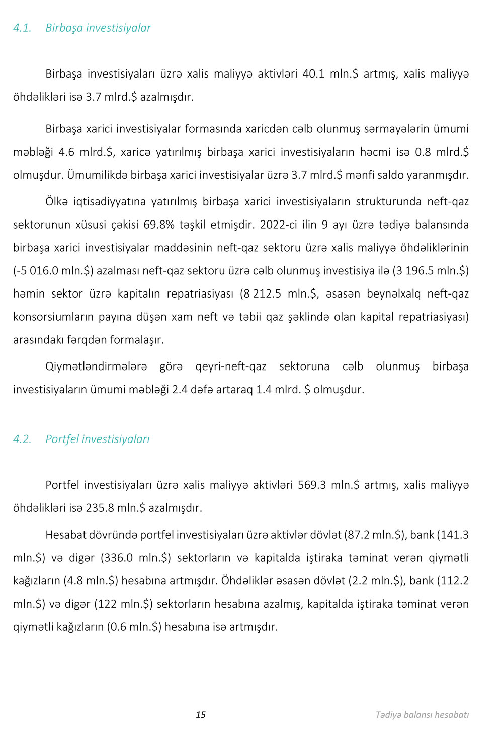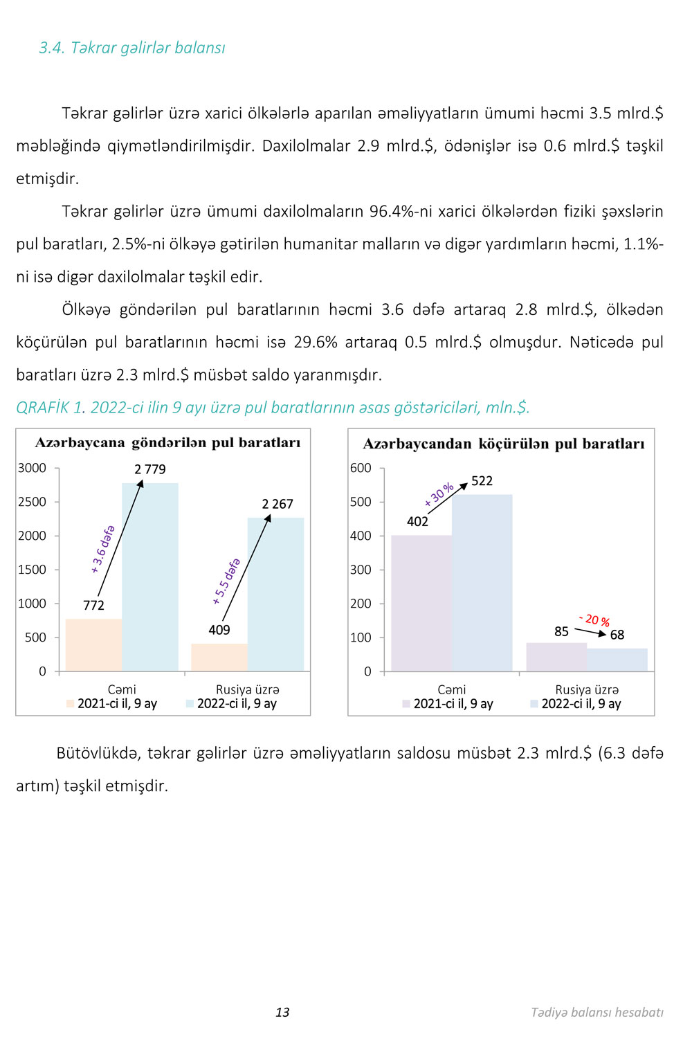 Qeyd edək ki, 2022-ci ilin 9 ayı üzrə tədiyə balansı əsasən qlobal əmtəə bazarlarında neft-qaz qiymətlərinin və qeyri-neft-qaz ixracının əhəmiyyətli artımından təsirlənmişdir. Cari əməliyyatlar balansında 17.7 milyard dollar profisit, kapital və maliyyənin hərəkəti hesabında isə 9.6 milyard dollar kəsir yaranmış, ehtiyat aktivləri 7.6 milyard dollar artmışdır. Bu dövrdə xam neftin orta qiyməti 107 dollar/barel olmuş, qeyri-neft-qaz ixracı isə 21.5% artaraq 2 milyard dollar səviyyəsində formalaşmışdır.