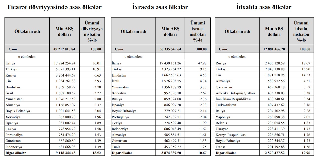 11 ayın yekunlarına görə, Rusiya Azərbaycanın ticarət tərəfdaşları arasında İtaliya və Türkiyədən sonra 3-cü yerdə qərarlaşıb.2022-ci ilin 11 ayı ərzində Azərbaycanla Rusiya arasında ticarət dövriyyəsi 3 milyard 264 milyon dollar təşkil edib ki, bu da ötən ilin müvafiq göstəricisindən 22,9 faiz çoxdur.