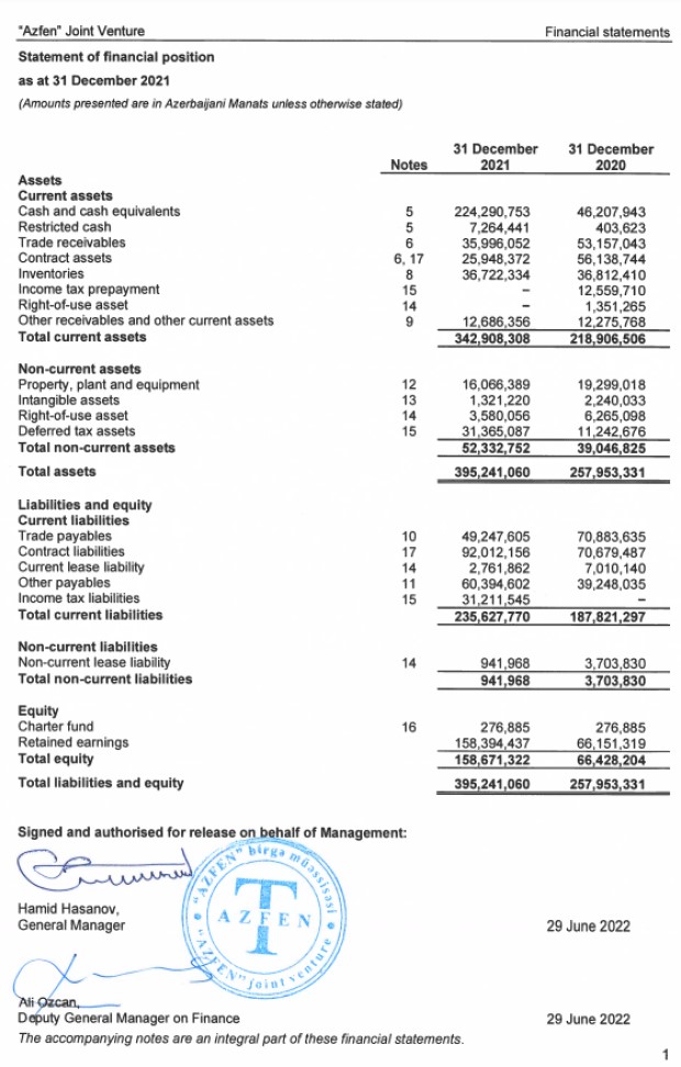 31 Dekabr 2021-ci il tarixində “Azfen” Birgə Müəssisəsi 395 milyon 241 min manat cəmi aktivlərə malik olub. Şirkıt 2020-ci ilin sonunda 257 milyon 953 min manat cəmi aktivlərə malik idi.