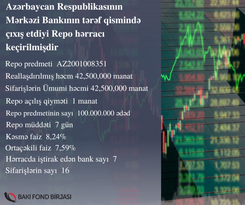 Azərbaycan Respublikasının Mərkəzi Bankının tərəf qismində çıxış etdiyi Repo hərracı keçirilmişdir