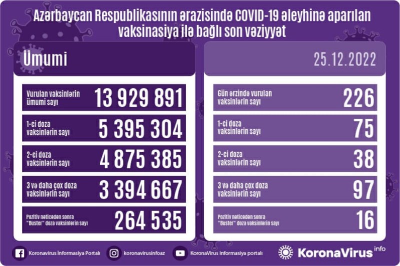 Azərbaycanda son sutkada koronavirus (COVID-19) əleyhinə 226 vaksin vurulub. Bir gündə birinci mərhələ üzrə vaksinasiya olunanların sayı 75, ikinci mərhələ üzrə vaksinasiya olunanların sayı 38, 3-cü və daha çox doza üzrə vaksinasiya olunanların sayı 97, pozitiv nəticədən sonra buster doza olunanların sayı isə 16 nəfərdir.
