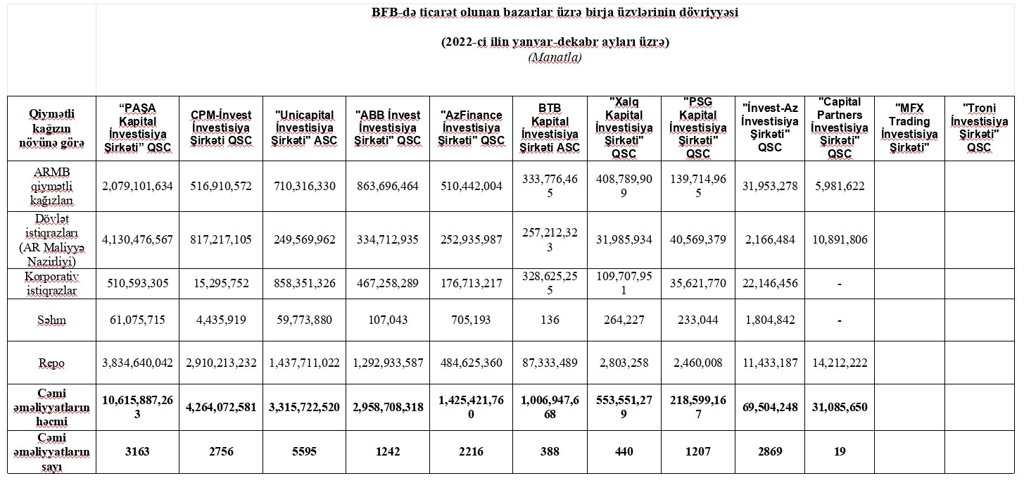 Marja.az Birja-ya istinadən xəbər verir ki, 2022-ci ilin yanvar-dekabr ayları ərzində 10 milyard 615 milyon 887 min 263 manat dövriyyə ilə“PAŞA Kapital İnvestisiya Şirkəti” QSC birinci, 4 milyard 264 milyon 72 min 581 manat dövriyyə ilə "CPM-İnvest İnvestisiya Şirkəti" QSC 2-ci, 3 milyard 315 milyon 722 min 520 manat dövriyyə ilə "Unicapital İnvestisiya Şirkəti" ASC 3-cü yeri tutub.