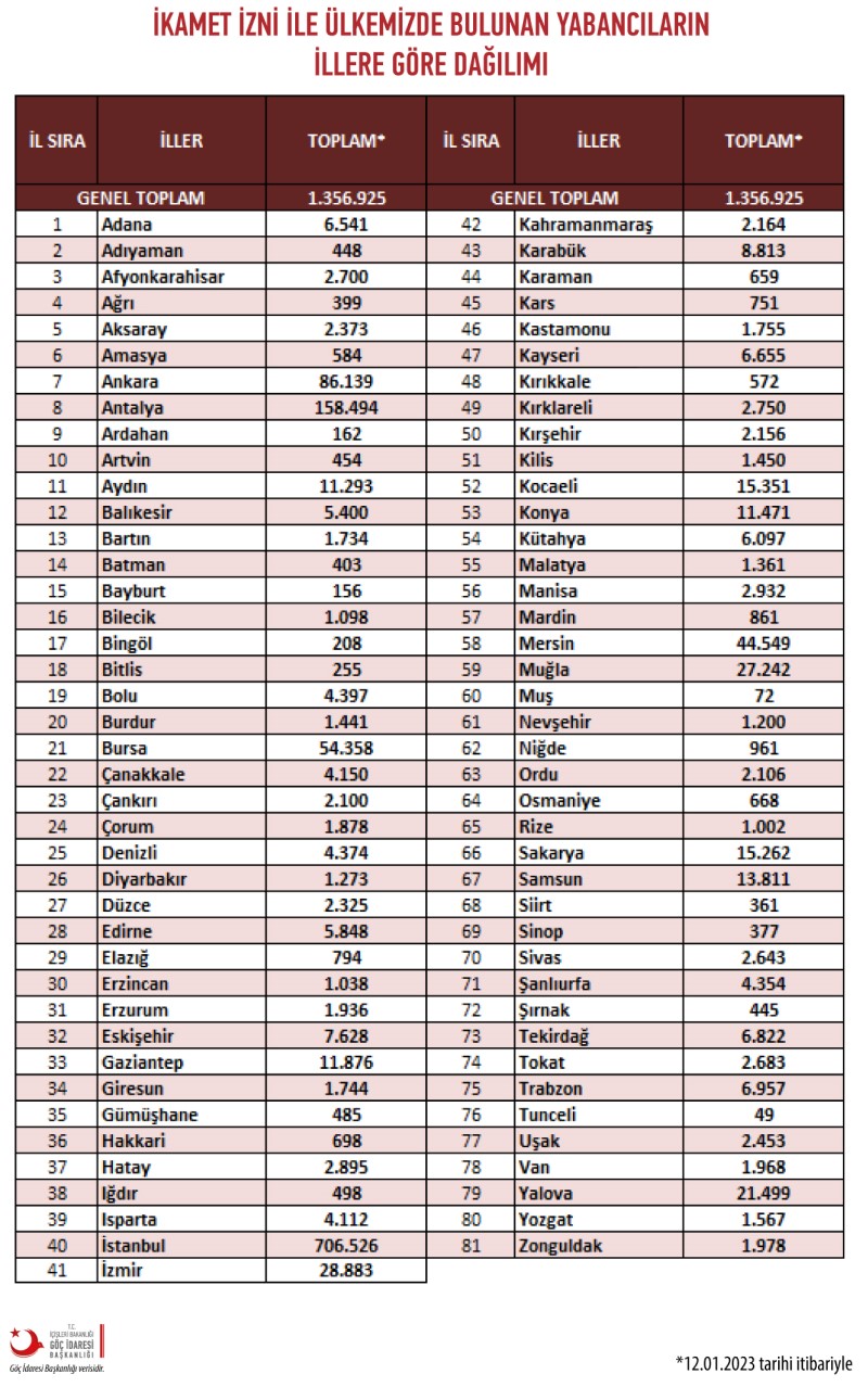 Türkiyədə yaşamaq icazəsi olan əcnəbilərin ümumi sayı 1 milyon 354 min nəfəri keçib. Azərbaycanlılar ölkədə qohumluq əlaqələri və ya təhsil əsasında verilən yaşayış icazələrinin sayına görə liderdir.Azərbaycanlılar Türkiyədə yaşayış icazəsi almış əcnəbilər arasında 6-cı yerdədir. 68 mindən çox Azərbaycan vətəndaşı Türkiyədə yaşamaq icazəsi alıb.