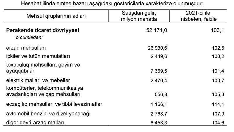 Dövlət Statistika Komitəsinin yaydığı məlumata görə, 2021-ci illə müqayisədə pərakəndə ticarət dövriyyəsi real ifadədə 3,1 faiz, o cümlədən ərzaq məhsulları, içkilər və tütün məmulatları üzrə 2,3 faiz, qeyri-ərzaq malları üzrə 4,0 faiz artmışdır.