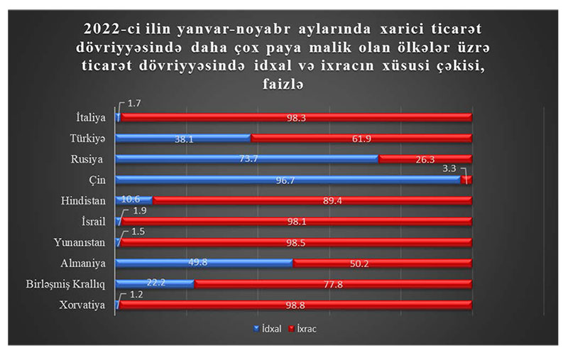 Ölkəyə idxal olunmuş məhsulların ümumi dəyərinin 18,7 faizi Rusiya, 15,9 faizi Türkiyə, 14,5 faizi Çin ilə aparılmış idxal əməliyyatlarının payına düşmüşdür.2022-ci ilin yanvar-noyabr aylarında Azərbaycan Respublikasının hüquqi və fiziki şəxsləri dünyanın 184 ölkəsindəki tərəfdaşları ilə ticarət əməliyyatları həyata keçirmiş, 121 ölkəyə məhsul ixrac olunmuş, 172 ölkədən idxal olunmuşdur.