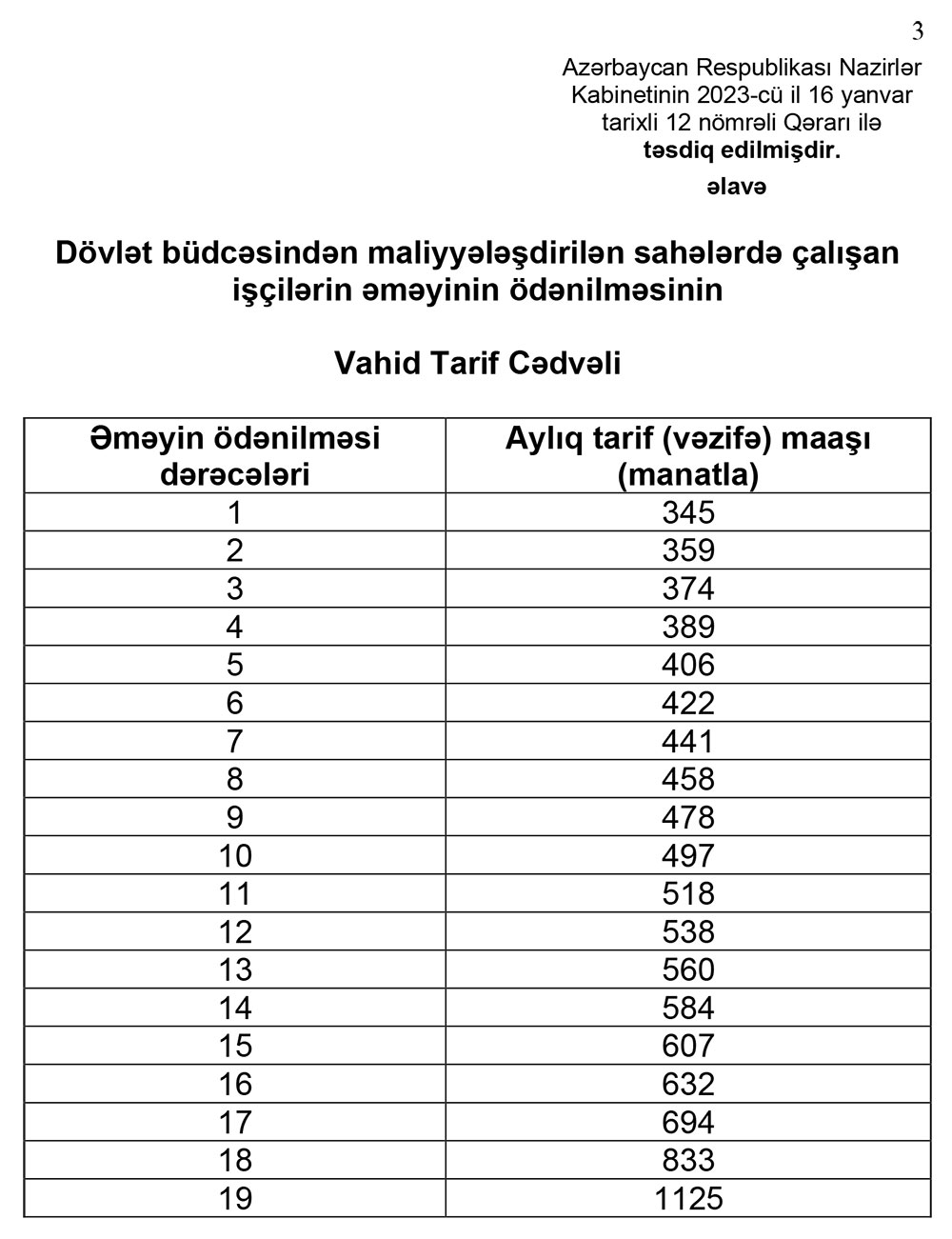Azərbaycan Respublikası Prezidentinin Sərəncamına əsasən minimum aylıq əməkhaqqının 1 yanvar 2023-cü ildən 345 manata çatdırılması ilə əlaqədar Nazirlər Kabineti dövlət büdcəsindən maliyyələşdirilən sahələrdə işləyənlərin tarif (vəzifə) maaşlarının da bu Sərəncama uyğunlaşdırılması üçün həmin işçilərin əməyinin ödənilməsinin yeni Vahid Tarif Cədvəlini təsdiq edib.