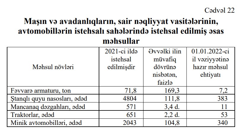 Xatırladaq ki, Dövlət Statistika Komitəsi 2021-ci il üzrə illik hesabatında, Azərbaycanda 2043 ədəd minik avtomobili istehsal olunduğunu açıqlamışdı. Komitə son hesabatında 2021-ci ildə 2 079 ədəd minik avtomobili istehsal edildiyinə işarə edib.